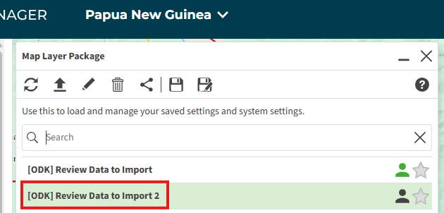 The map layer can be opened by loading the Map Layer Package "[ODK] Review Data to Import 2".