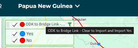 - All points displayed in the map layer "ODK to Bridge Link - Clear to Import and Import Yes" are blue.